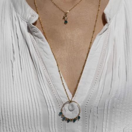 Gold filled longnecklace composed of a shiny ring surrounded by 5 fine blue apatite stones and golden pearls, all mounted with a gold filled wire. Very refined, it brings a very feminine and resolutely sophisticated touch to your outfit.