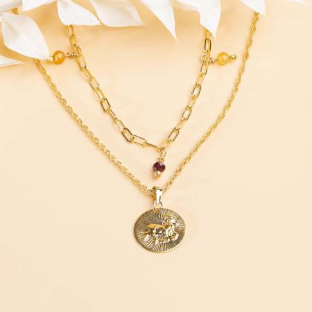 ¡Cuánta originalidad con este collar doble en cadena de rectángulos y cadena corde! Está adornado con piedras semipreciosas naturales y con un colgante redondo con un signo zodiacal en un fondo estriado. Cierre de dos aros corredizos.