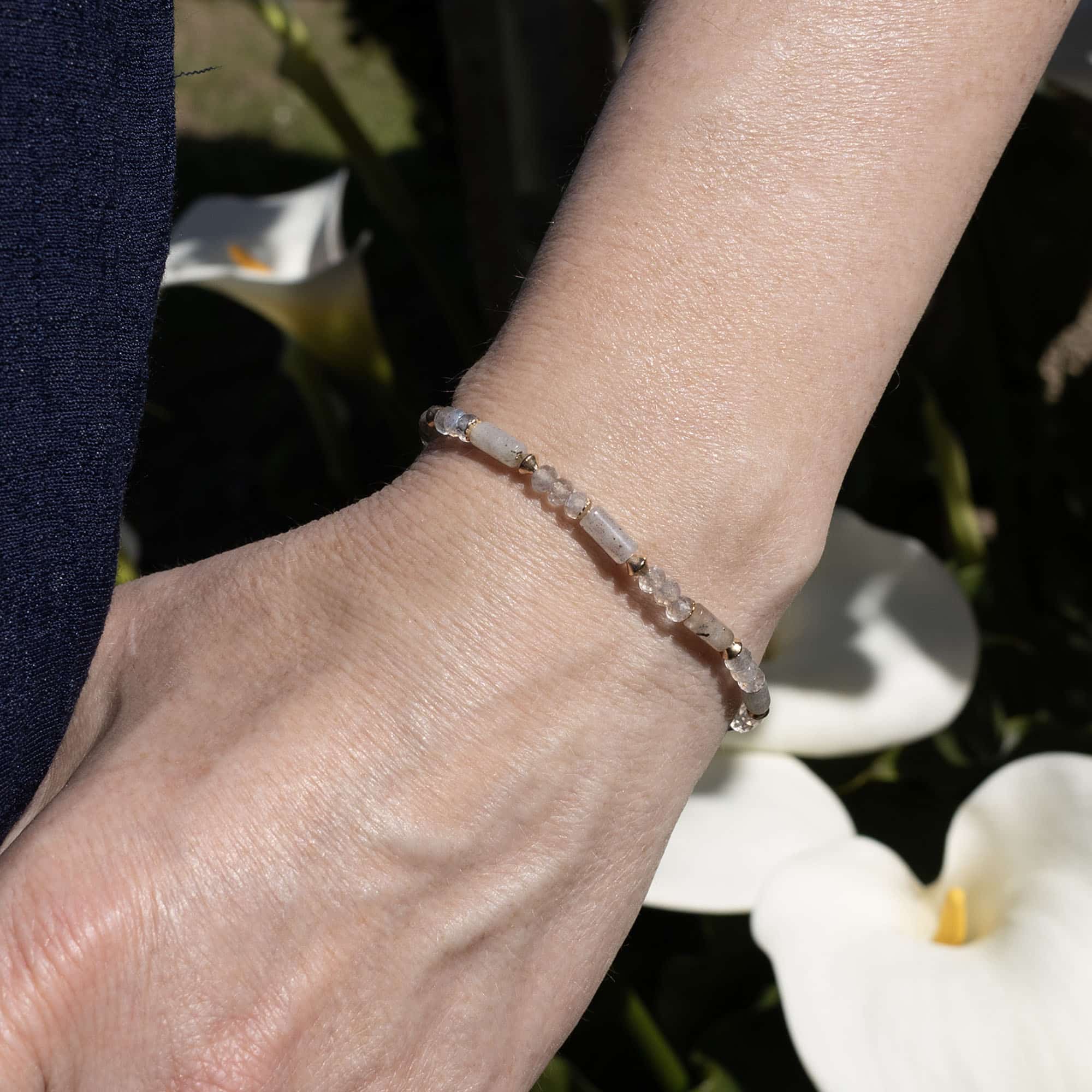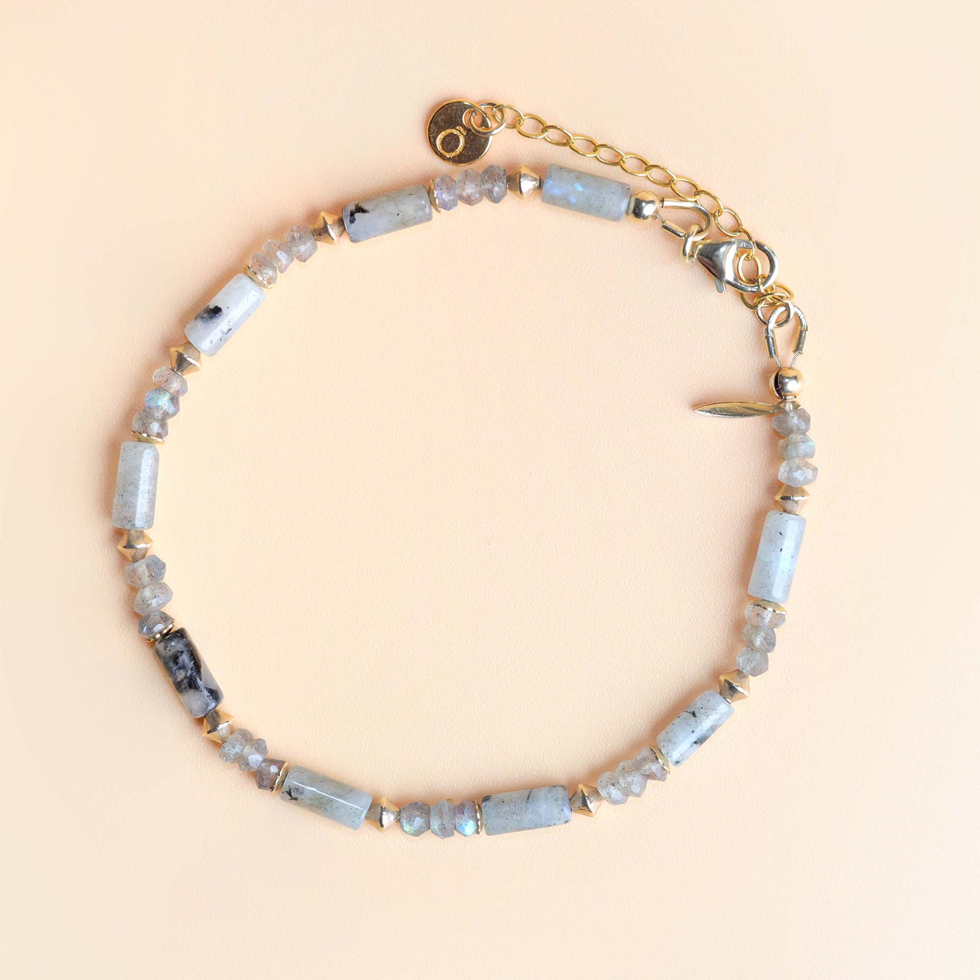Brazalete original adornado con piedras semipreciosas naturales en labradorita y bañado en oro.
