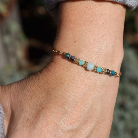 Esta pulsera con múltiples piedras finas, en bonitos tonos de azul, está llena de energía. Una pulsera chic y bohemia que te hará sucumbir a la belleza de sus piedras con múltiples virtudes.