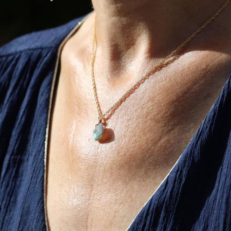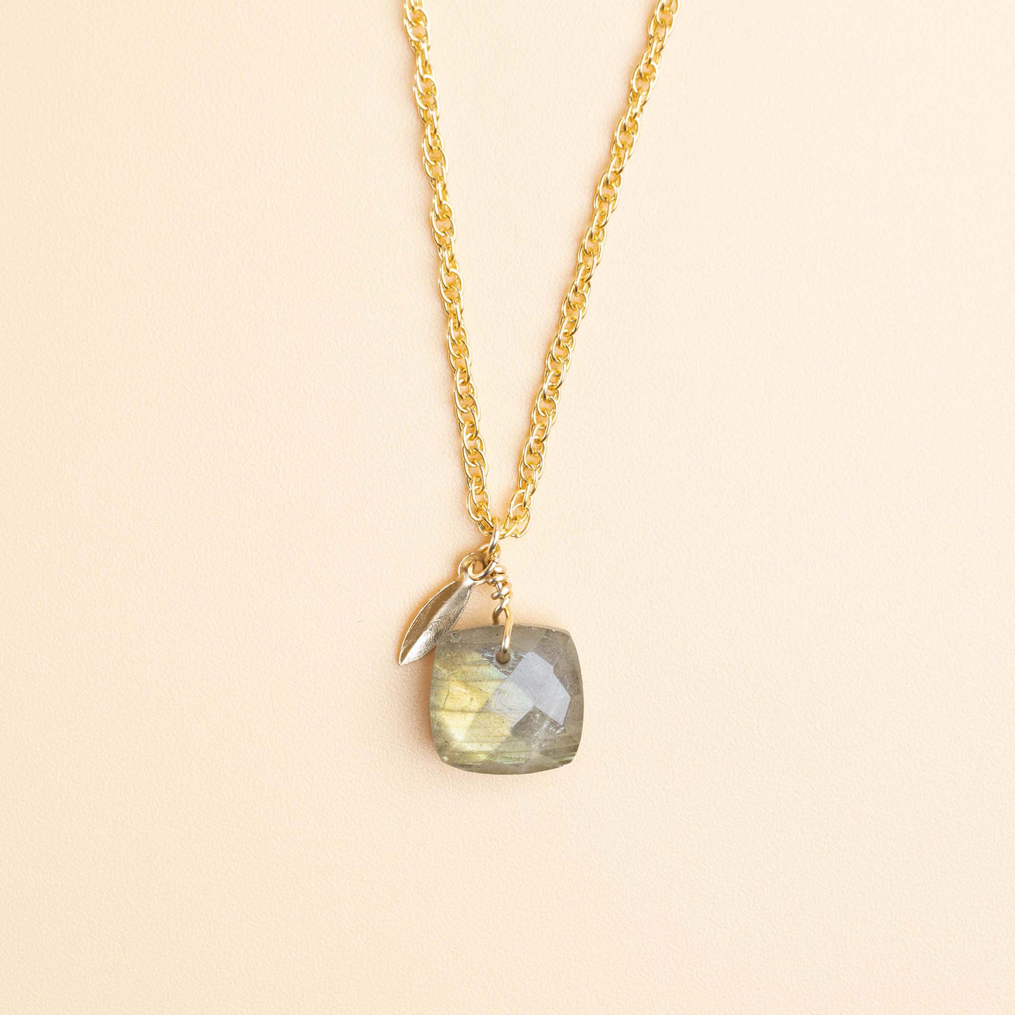 Collar en cadena corde adornado con una linda piedra semipreciosa natural en labradorita tallada en faceta. Cierre de resorte.