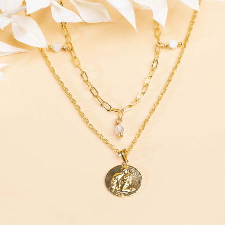 ¡Cuánta originalidad con este collar doble en cadena de rectángulos y cadena corde! Está adornado con piedras semipreciosas naturales y con un colgante redondo con un signo zodiacal en un fondo estriado. Cierre de dos aros corredizos.