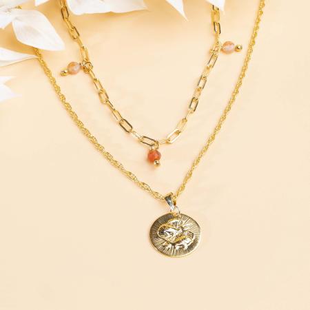 ¡Cuánta originalidad con este collar doble en cadena de rectángulos y cadena corde! Está adornado con piedras semipreciosas naturales y con un colgante redondo con un signo zodiacal en un fondo estriado. Cierre de dos aros corredizos.