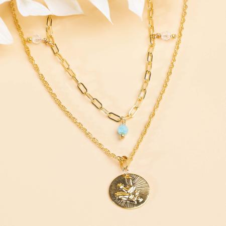 ¡Cuánta originalidad con este collar doble en cadena de rectángulos y cadena corde! Está adornado con piedras semipreciosas naturales y con un colgante redondo con un signo zodiacal en un fondo estriado. Cierre de dos aros corredizos.