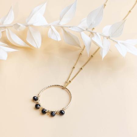 Collar largo bañado en oro compuesto por un anillo brillante rodeado de 5 finas espinelas negras y perlas doradas, todo ello montado con un hilo bañado en oro.