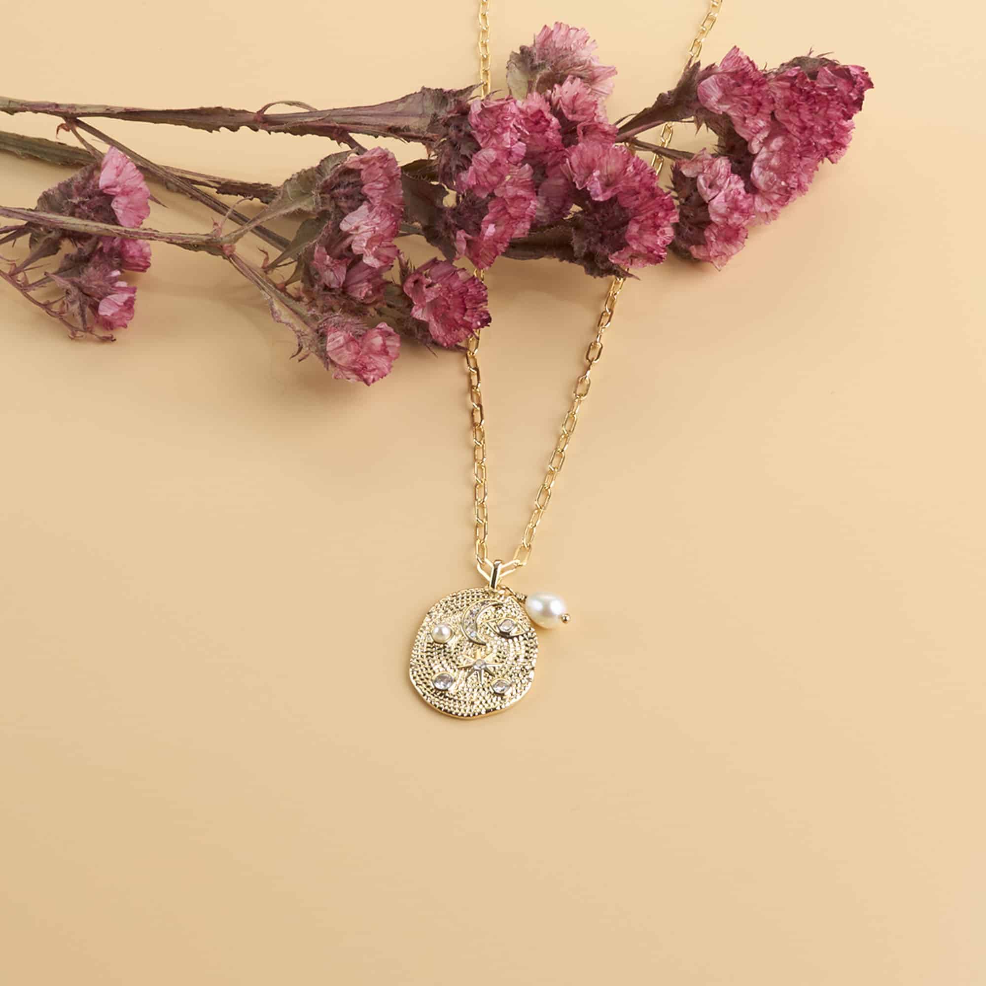 La elegancia y suavidad de las perlas de agua dulce se fusionan delicadamente con el oro laminado. Este hermoso collar irradia un brillo sutil, perfecto para realzar momentos preciados.