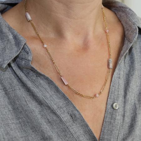 La colección Lueur muestra su originalidad con sus piedras rectangulares y redondas. Con su bonita cadena martillada, este collar completará todos tus conjuntos. También disponible en amazonita.