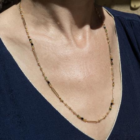 Bonita cadena con malla rectangular y finas arandelas cinceladas, está adornada con bonitas piedras finas de ágata negra, hematita bañada en oro, turmalina verde y granate africano verde. Elegante y precioso, tiene la longitud ideal para escotes bonitos.
