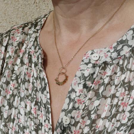Este collar está formado por una cadena de malla forzada decorada con dos círculos entrelazados adornados con bonitas y finas piedras de granate africano verde facetadas.