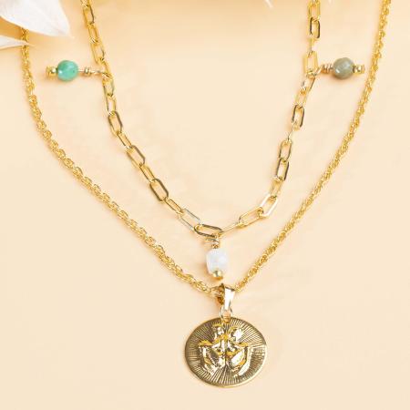 ¡Cuánta originalidad con este collar doble en cadena de rectángulos y cadena corde! Está adornado con piedras semipreciosas naturales y con un colgante redondo con un signo zodiacal en un fondo estriado. Cierre de dos aros corredizos.