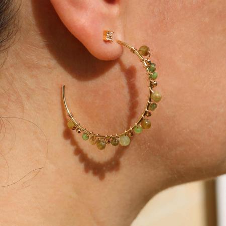 Pendientes de aro de elegancia contemporánea, este par de finos pendientes de aro se distingue por sus tonalidades verdes que contrastan con el brillo del oro. Para cualquier ocasión, esta joya de piedras finas tejida a mano aportará carácter a tus looks prometiéndote un estilo trendy casual chic.
