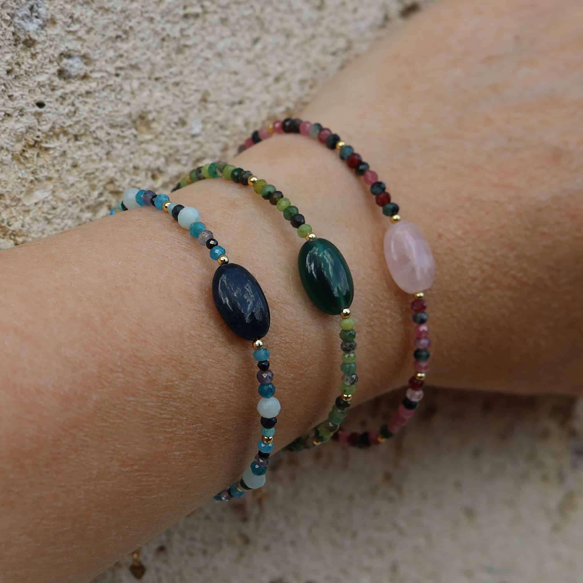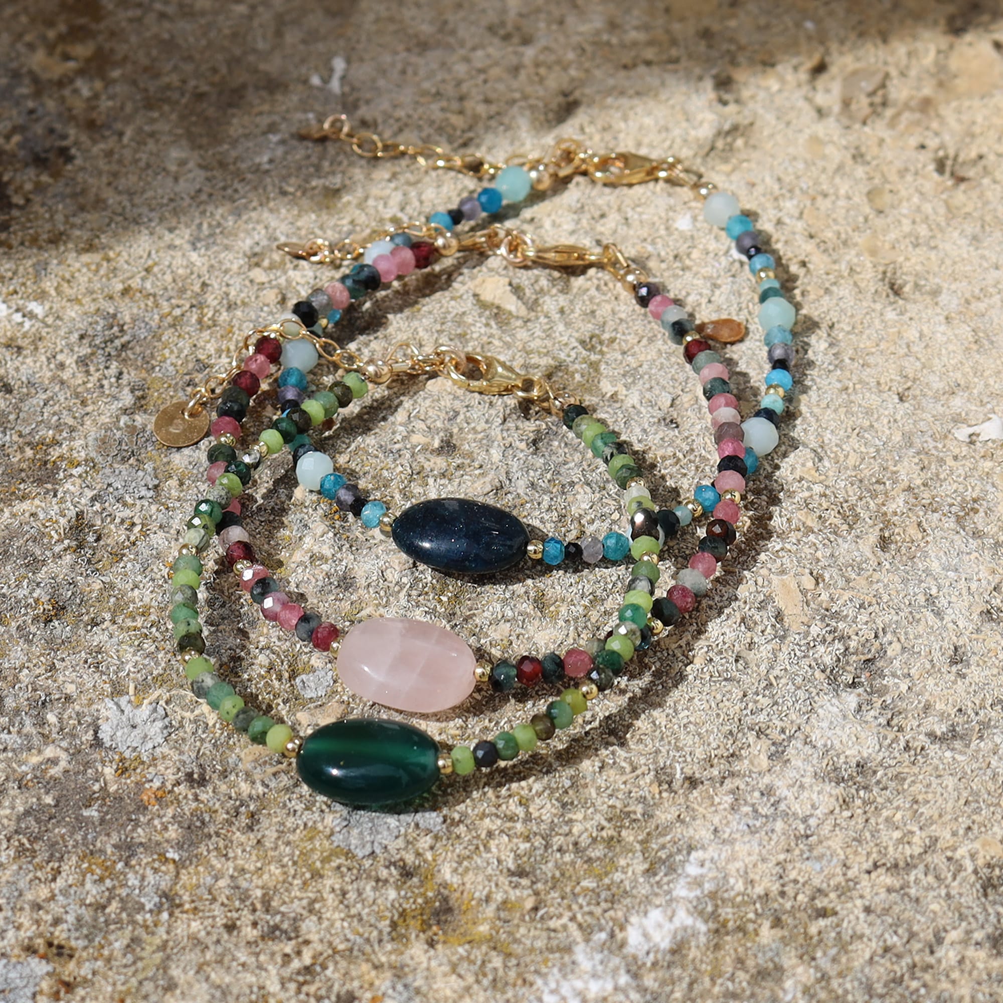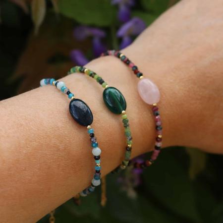 Dale un toque de luz y energía positiva a tu atuendo con esta significativa pulsera, que combina delicadamente piedras preciosas y oro laminado. Esta sofisticada pieza complementará cualquier look.