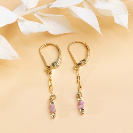 Zarcillos adornados con perlas doradas y con piedras semipreciosas naturales.