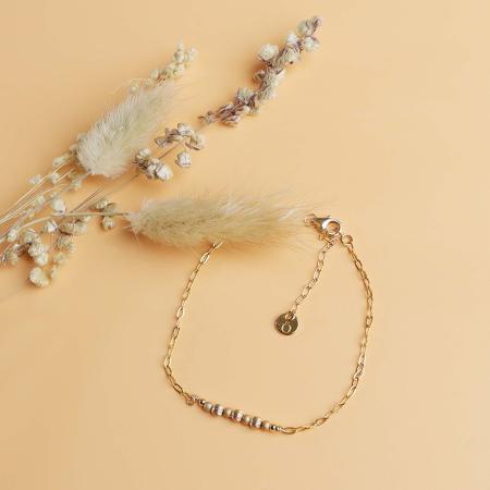 Bracelet en chaîne maille rectangle embelli de 9 petites perles rondes striées et brillantes. Fermoir mousqueton.
