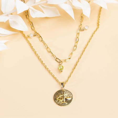 Quelle originalité avec ce collier double en chaîne maille rectangle et en chaîne maille corde ! Celui-ci est embelli de pierres fines naturelles et d’une breloque ronde signe du zodiaque sur un fond strié. Fermoir 2 rangs coulissant.