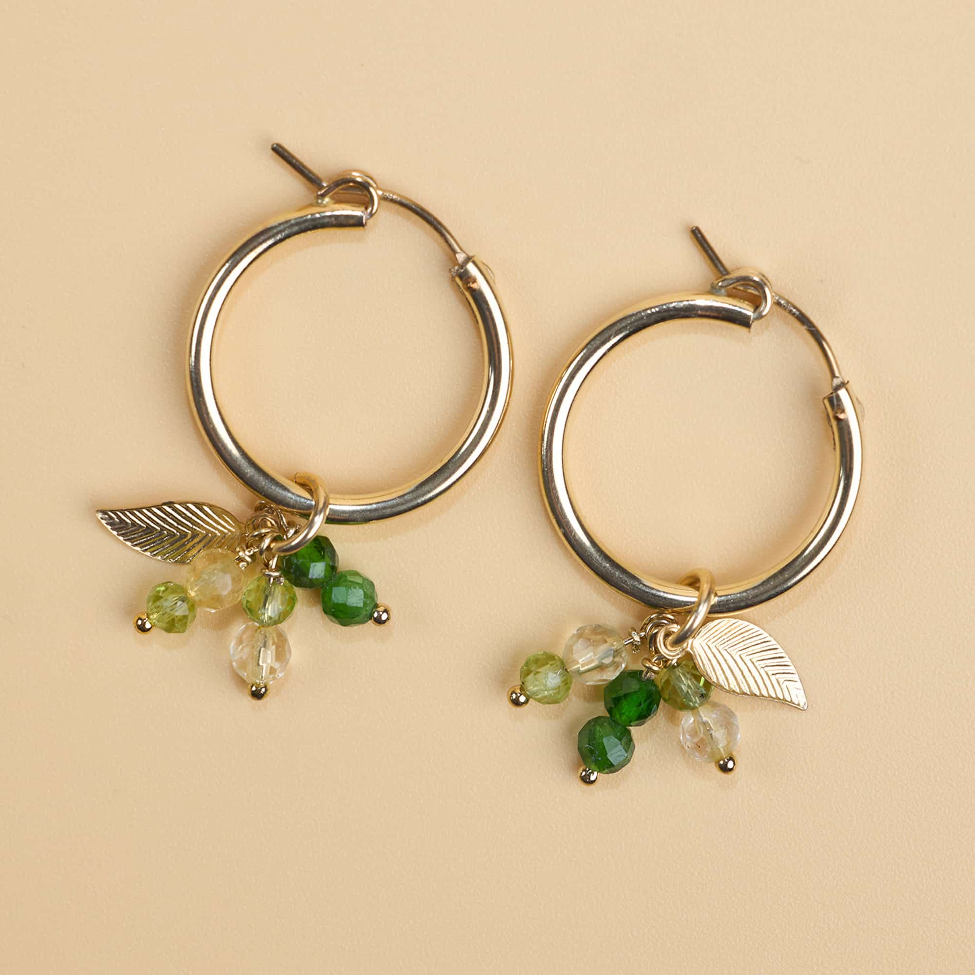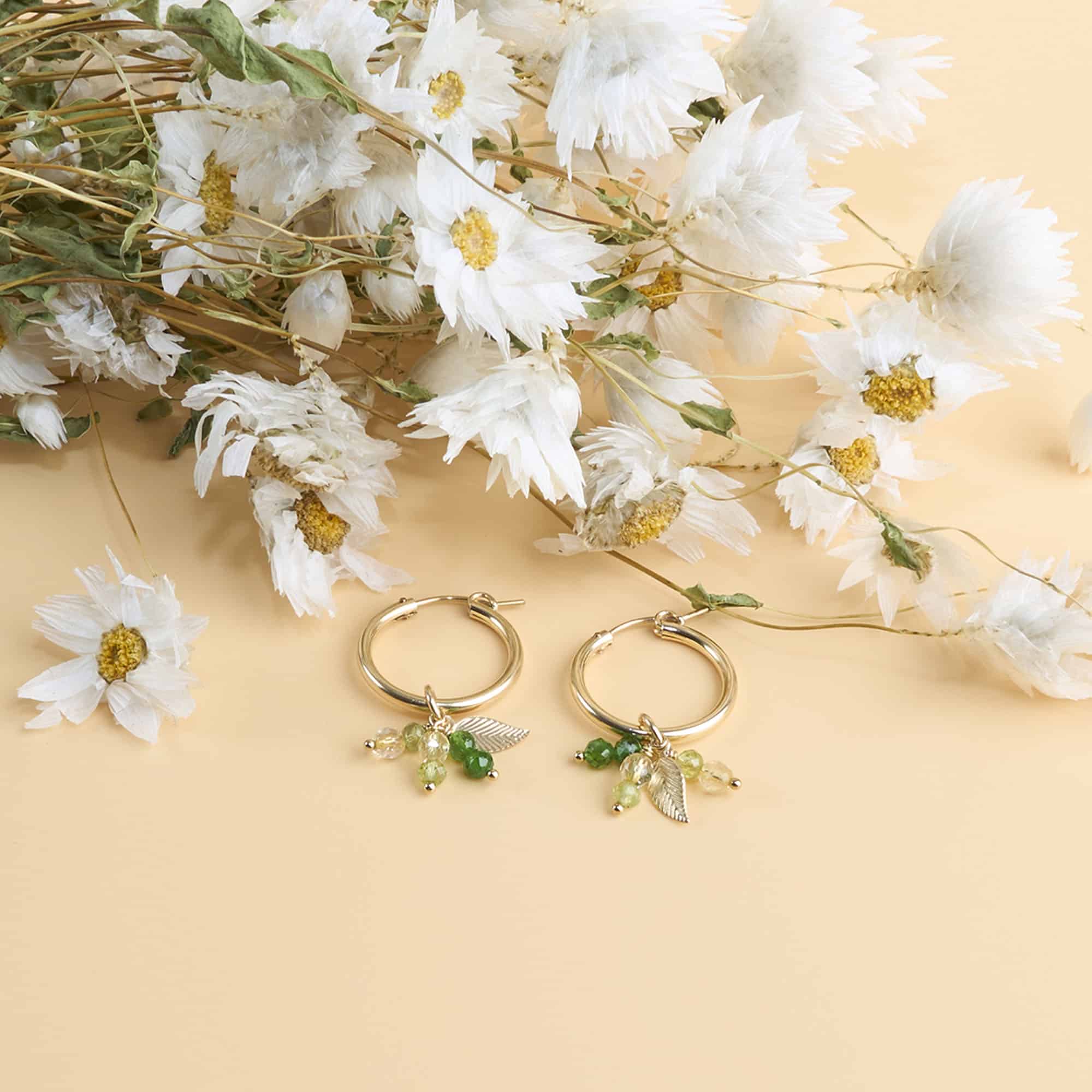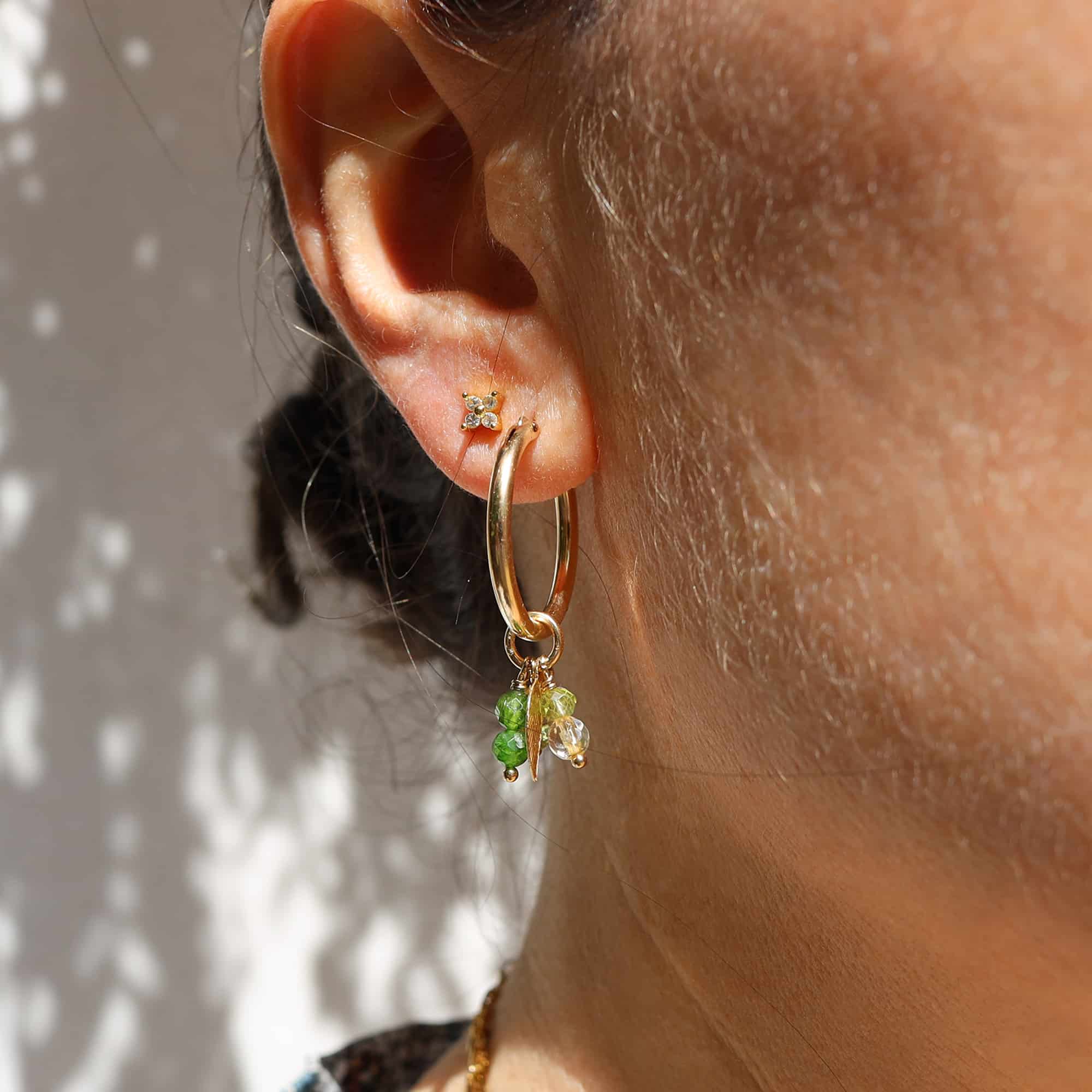 Ces boucles se composent d’une mini-créole agrémentée de petites fines de diopside vert, péridot et citrine, qui virevoltent telles de jolies petites pampilles.